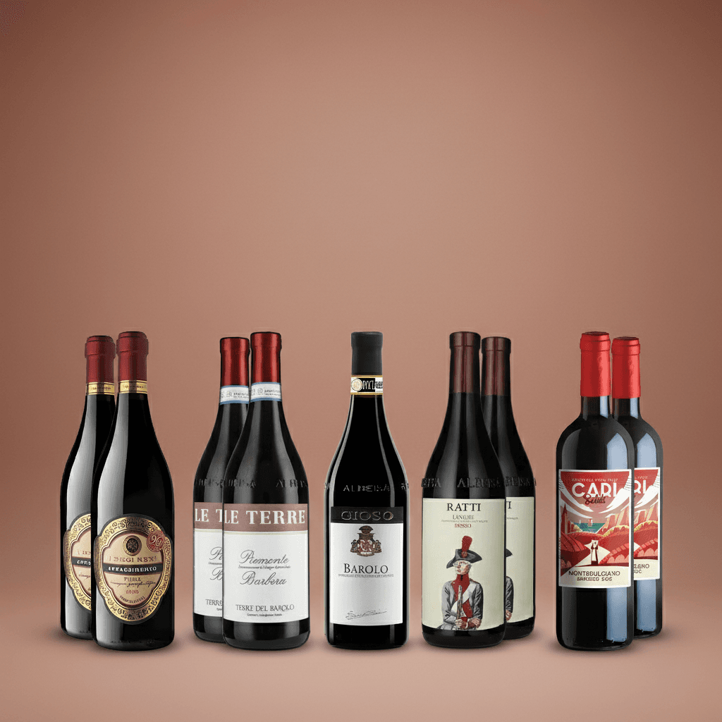 Lådan bjuder på en spännande mix av druvor och stilar. Här hittar du en prestigefylld Barolo från Gioso som bjuder på komplexitet och djup, samt en frisk och bärig Barbera från Le Terre. Från Abruzzo kommer en smakrik Montepulciano d'Abruzzo som är känd för sin mjuka struktur. Vi har även inkluderat I Dogi Neri, ett vin gjort med Appassimento metoden där torkade druvor ger en extra fyllig smak, samt ett modernt Langhe Rosso från Ratti som binder samman hela kollektionen.